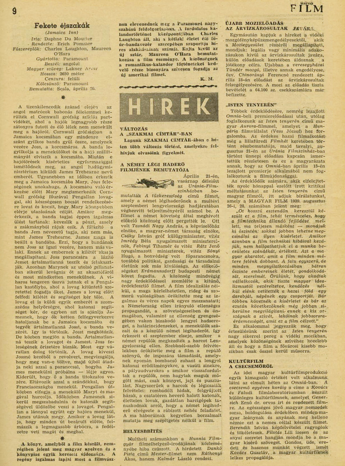 Jamaica Inn - Fekete éjszakák - 1939 - (ismertető) (Magyar Film, 1940/17. II.évf./17.szám, 9.oldal -1940.ápr.27.)