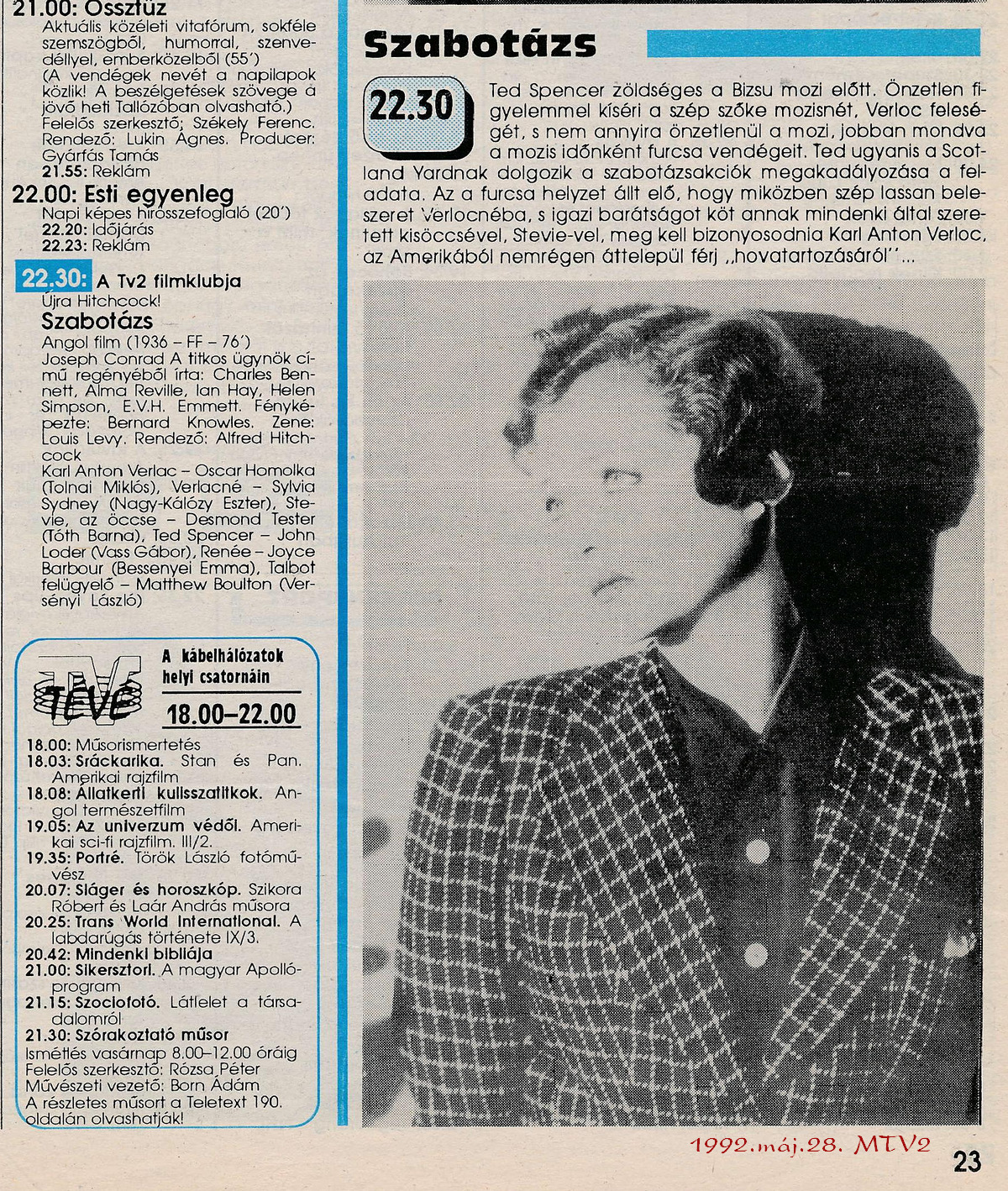 A Szabotázs (1936) 1992.tavaszán a Tv2 filmklubjában