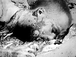 hullákkal, egy "portré", valaha szép női arc, nyitott, véres szájjal;