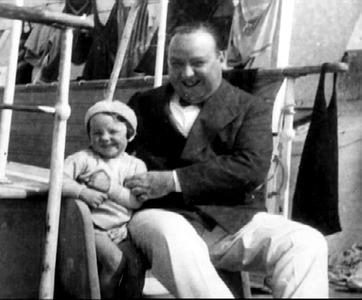 William Hitchcock a kicsi Alfreddal a családi bolt előtt (1900-as évek eleje) |
