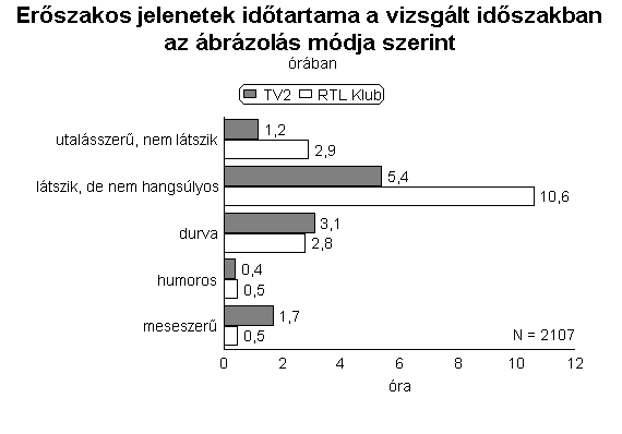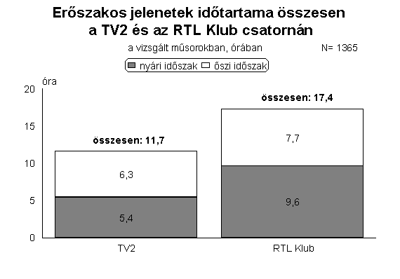 Az adatok egy másfajta megközelítése azt is elárulja, hogy az RTL-nél nem csupán az erőszakos jeleneteket tartalmazó műsorszámok aránya volt magasabb, hanem az agressziót prezentáló jelenetek összesített hossza is. A két vizsgált héten az RTL Klubon több mint 17 órán keresztül sugároztak erőszakos jeleneteket, a TV2-n valamivel kevesebb, mint 12 órán át. A két időszak valamennyi műsorsávjában az RTL-nél volt magasabb az erőszakos jelenetek bemutatásával eltöltött műsoridő mértéke. E televízió műsoridejének 13 százaléka tartalmazott agresszív jeleneteket, a TV2-n ugyanez az arány 7 százalékot ért el.