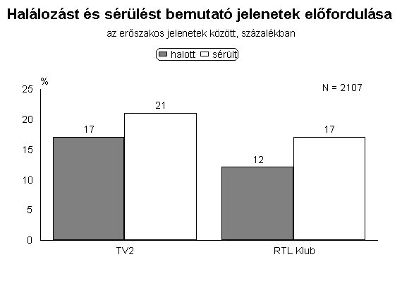 Vizsgálatunk eredményei azt mutatják, hogy az RTL Klub műsorkínálatának erőszaktartalma magasabb, mint a TV2-é. Ez a következtetés leginkább azon alapul, hogy az RTL műsoraiban gyakrabban voltak agresszív aktusokat is bemutató műsorszámok, valamint az erőszak műsorideje is nagyobb volt, mint a vetélytársnál. Az erőszakos jelenetek prezentálásának vizsgálata arról is árulkodik, hogy a TV2-n az agresszió bemutatása valamivel naturálisabban történt. Ezen a csatornán többször láthattak a nézők gyilkosságot vagy gyilkossági kísérletet, de kétszer gyakoribbak voltak azok a műsorrészek is, amelyek az agresszivitást durvábban jelenítették meg, azaz, amelyek sérüléseket, emberi szenvedéseket nem csak utalásszerűen, hanem részletesen is bemutattak (az agresszív jelenetek 18 százalékában történt ilyen). A naturálisabb erőszak-ábrázoláshoz tartozik, hogy a TV2 erőszakos jeleneteiben rendszeresebben voltak láthatók halott és sérült emberek.