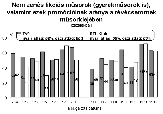 A két kereskedelmi csatorna műsorszolgáltatási jegyzőkönyveinek adataiból egyértelműen kiderül, hogy a TV2 napi átlagos műsorideje hosszabb, mint konkurenséé. A TV2 az elemzett műsortípusok összesített műsorideje tekintetében is megelőzte az RTL Klubot. A TV2 előtt ülve a nézők, a két vizsgált hét alatt, összesen 160 órán keresztül kísérhettek figyelemmel nem zenés fikciós műsorokat, gyerekműsorokat, illetve ezek promócióit. Ugyanezen műsortípusok 135 órán keresztül voltak láthatók az RTL Klubon. Abban a tekintetben viszont megegyezett a két csatorna, hogy műsoridejük több mint felét tették ki a kutatásunk tárgyát képező műsorszámok.