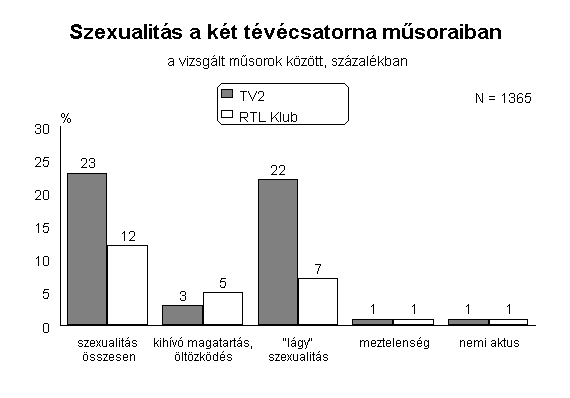 Szexuális tartalom a TV2 műsoraiban jelentősen gyakrabban fordult elő, mint az RTL-nél. Az előbbi csatorna műsorainak 23 százaléka mutatott be szexuális jellegű eseményeket vagy képsorokat, miközben az RTL-nél ez az arány csak 12 százalék volt (3. ábra). Az eredmények azt is megmutatták, hogy a TV2-n (de az RTL Klubon is) elsősorban “lágy” szexuális ábrázolásról volt szó, vagyis műsorainak negyedében csókolózást, ölelkezést láthattak a nézők.