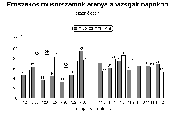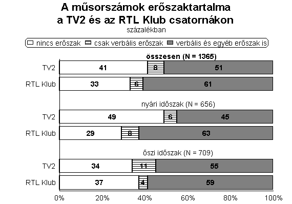 Elöljáróban leszögezhetjük, hogy az RTL műsorszámai között gyakrabban tűntek fel olyanok, amelyekben tetten érhető volt valamilyen erőszakos aktus. A két időszak összevetéséből kiderült az is, hogy ez a különbség elsősorban a nyári műsorhét kínálatának volt köszönhető. Ennek minden bizonnyal az a magyarázata, hogy nyáron az emberek kevesebbet televízióznak, így az erőszak egyfajta nézőcsalogatónak számít. Ekkor az RTL műsorszámainak 63 százalékában volt olyan jelenet, amelynek cselekménye agresszivitást tartalmazott, a TV2-nél ez az arány “csak” 45 százalékot tett ki. Lényegesen kisebb különbséget regisztráltunk a két csatorna között novemberben. Igaz, ekkor is az RTL Klub műsoraiban találtunk nagyobb arányban erőszakos jeleneteket, ám a két médium közötti különbség mindössze négy százalékra csökkent. Az RTL műsorválasztéka mindenekelőtt a hétköznapokon sugárzott műsorai miatt tekinthető erőszakosabbnak konkurensénél. Hétvégén nagyjából azonos arányban fordultak elő agresszív tartalmú műsorok a két műsorszolgáltatónál. További hasonlóságot jelent a csatornák között, hogy az egyestés filmekben volt a legnagyobb az erőszak mértéke. Az RTL Klub ebben a tekintetben is felülmúlta vetélytársát, hiszen ezen filmjeinek több mint 90 százalékában volt legalább egy agresszív aktust bemutató jelenet, a TV2 filmjeinek viszont “csak” háromnegyedéről mondható el ugyanez. Az RTL kínálatában ráadásul a sorozatokban és gyerekrajzfilmekben is gyakrabban bukkantak fel erőszakos műsorok.