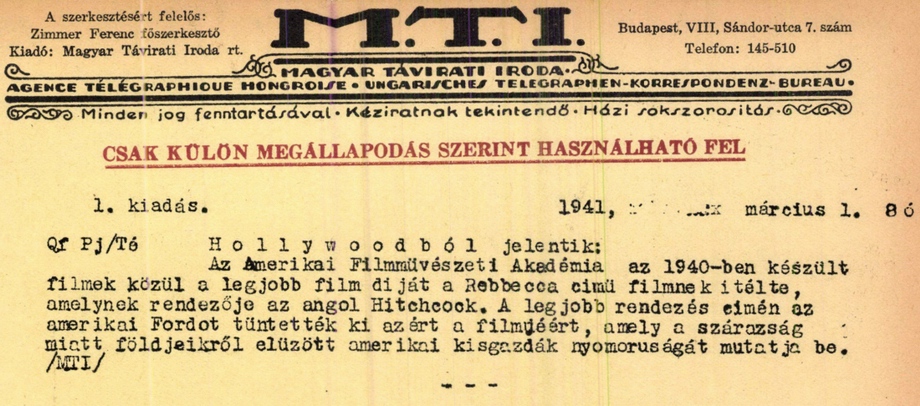 MTI - Magyar Távirati iroda (1941.március.1.)