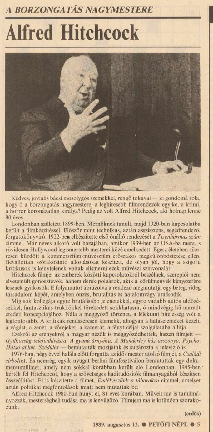 A borzongatás nagymestere: Alfred Hitchcock (Petőfi Népe, 1989.aug. 12.; 5.oldal)