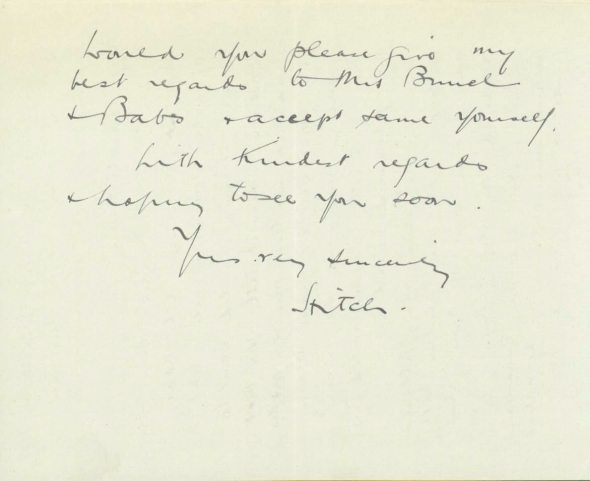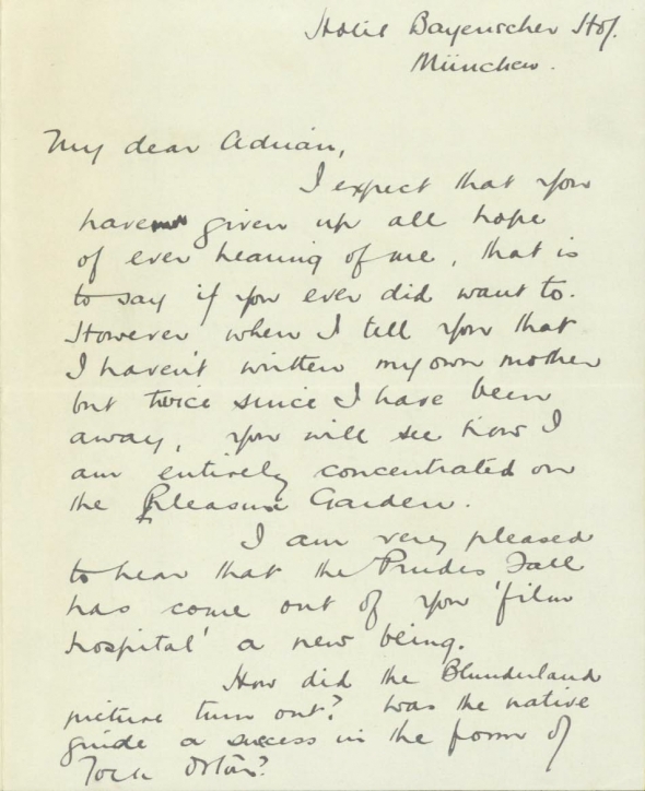 I expect that you have given up all hope of ever hearing of me, that is to say if you ever did want to. However, when I tell you that I haven’t written my own mother but twice since I have been away, you will see how I am entirely concentrated on The Pleasure Garden. I am very pleased to hear that The Prude’s Fall has come out of your ‘film hospital’ a new being. How did the Blunderland picture turn out? Was the native guide a success in the form of Jock Orton? Of course you have heard that I have two stars under my banner – quite a handful as a matter of fact. I have seen very little of Munich since I have been out here – only the studio and my hotel room are the ‘sights’ of this beautiful city I have been permitted to see. Have you seen any new good films at the Tivoli? I shall be interested to hear from you of any new developments in screen art because I am fairly isolated here. How is Christopher – has he cracked any new ones lately? Would you please give my best regards to Mrs Brunel and Babs and accept same yourself. With kindest regards and hope to see you soon. Yours sincerely, |