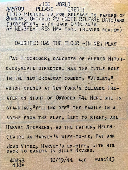 kis epizódszerepet. 1939-ben Hitchcock családostól az USA-ba költözött, később Patricia a Brodway-on szerepelt pár darabban (Solitaire,1943; Violet, 1944). Apja több filmjében játszott kisebb epizódszerepeket.