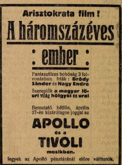 The Three-Hundred-Year-Old Man is the reconstruction of a lost silent film made in 1914 on the basis of an album of 66 photographs kept in the Film Archive. The 50-minute silent film was made to raise money for charity: the aristocratic group initiating the making of the film exploited the popular medium of film to promote a new achievement, aviation. The screenplay was written by Sándor Bródy and Endre Nagy, its actors were young Hungarian aristocrats, many of whom later became notable personalities. Money raised from the film was to go to improve Hungarian aviation and the Polyclinic.