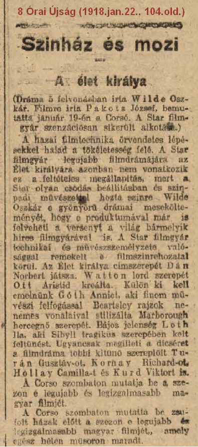 - Néhány héttel Deésy Alfréd filmjének elkészülése előtt, 1917. október 1-én az Uránia mozi bemutatta Oscar Wilde híres regényének német filmadaptációját: Das Bildnis des Dorian Gray, rendezője Richard Oswald volt, a címszerepet Bernd Aldor játszotta (hossza 1755 méter volt, 5 felvonásból állt).