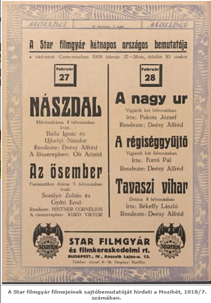 a Pesti Hírlap 1918. március 8-án beszámolt. Lehetséges, hogy a korábbi bemutató elmaradt.