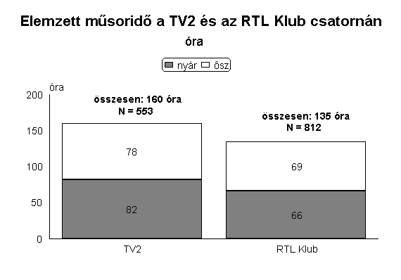A két kereskedelmi csatorna műsorszolgáltatási jegyzőkönyveinek adataiból egyértelműen kiderül, hogy a TV2 napi átlagos műsorideje hosszabb, mint konkurenséé. A TV2 az elemzett műsortípusok összesített műsorideje tekintetében is megelőzte az RTL Klubot. A TV2 előtt ülve a nézők, a két vizsgált hét alatt, összesen 160 órán keresztül kísérhettek figyelemmel nem zenés fikciós műsorokat, gyerekműsorokat, illetve ezek promócióit. Ugyanezen műsortípusok 135 órán keresztül voltak láthatók az RTL Klubon. Abban a tekintetben viszont megegyezett a két csatorna, hogy műsoridejük több mint felét tették ki a kutatásunk tárgyát képező műsorszámok.