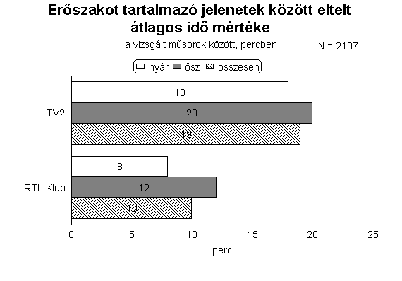 Az adatok egy másfajta megközelítése azt is elárulja, hogy az RTL-nél nem csupán az erőszakos jeleneteket tartalmazó műsorszámok aránya volt magasabb, hanem az agressziót prezentáló jelenetek összesített hossza is. A két vizsgált héten az RTL Klubon több mint 17 órán keresztül sugároztak erőszakos jeleneteket, a TV2-n valamivel kevesebb, mint 12 órán át. A két időszak valamennyi műsorsávjában az RTL-nél volt magasabb az erőszakos jelenetek bemutatásával eltöltött műsoridő mértéke. E televízió műsoridejének 13 százaléka tartalmazott agresszív jeleneteket, a TV2-n ugyanez az arány 7 százalékot ért el.