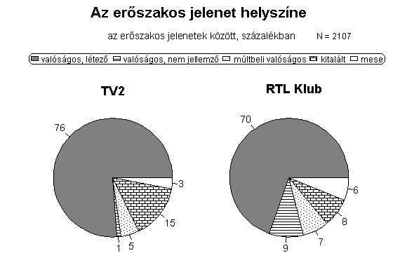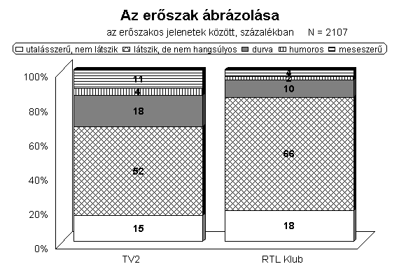 Vizsgálatunk eredményei azt mutatják, hogy az RTL Klub műsorkínálatának erőszaktartalma magasabb, mint a TV2-é. Ez a következtetés leginkább azon alapul, hogy az RTL műsoraiban gyakrabban voltak agresszív aktusokat is bemutató műsorszámok, valamint az erőszak műsorideje is nagyobb volt, mint a vetélytársnál. Az erőszakos jelenetek prezentálásának vizsgálata arról is árulkodik, hogy a TV2-n az agresszió bemutatása valamivel naturálisabban történt. Ezen a csatornán többször láthattak a nézők gyilkosságot vagy gyilkossági kísérletet, de kétszer gyakoribbak voltak azok a műsorrészek is, amelyek az agresszivitást durvábban jelenítették meg, azaz, amelyek sérüléseket, emberi szenvedéseket nem csak utalásszerűen, hanem részletesen is bemutattak (az agresszív jelenetek 18 százalékában történt ilyen). A naturálisabb erőszak-ábrázoláshoz tartozik, hogy a TV2 erőszakos jeleneteiben rendszeresebben voltak láthatók halott és sérült emberek.