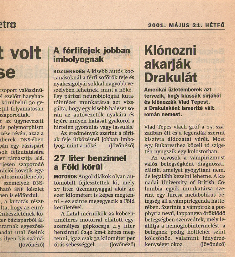 budapesti METRO újság 2001.május 21-i (hétfő)-i számában a 16.oldalon